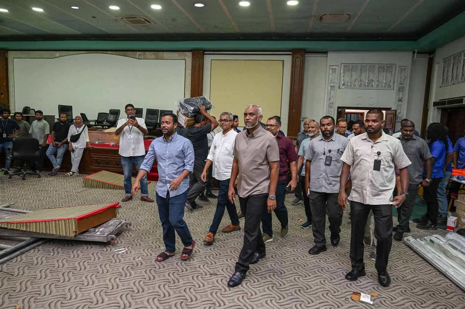 President Dr. Mohamed Muizzu visited Dharubaaruge convention centre on Friday evening to assess the ongoing preparations for restarting operations of three government ministries whose offices were severely damaged in a Thursday morning fire.
