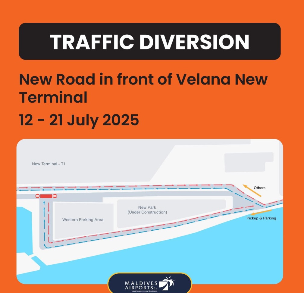 Traffic around Velana International Airport (VIA) has been temporarily rerouted as drainage works continue on the approach road to the airport’s new international terminal, the Maldives Airports Company Limited (MACL) has announced.