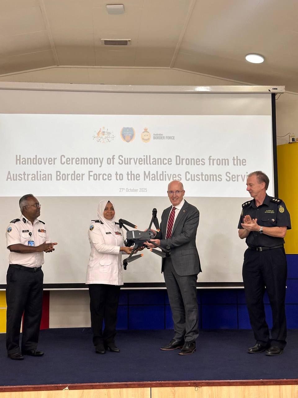 A special handover ceremony was held at the Customs headquarters to mark the occasion. During the event, Australian Ambassador to the Maldives David Jessup officially presented the drones—donated by the Australian Border Force—to Commissioner General of Customs Fathimath Dhiyana, who accepted them on behalf of the Maldives Customs Service.