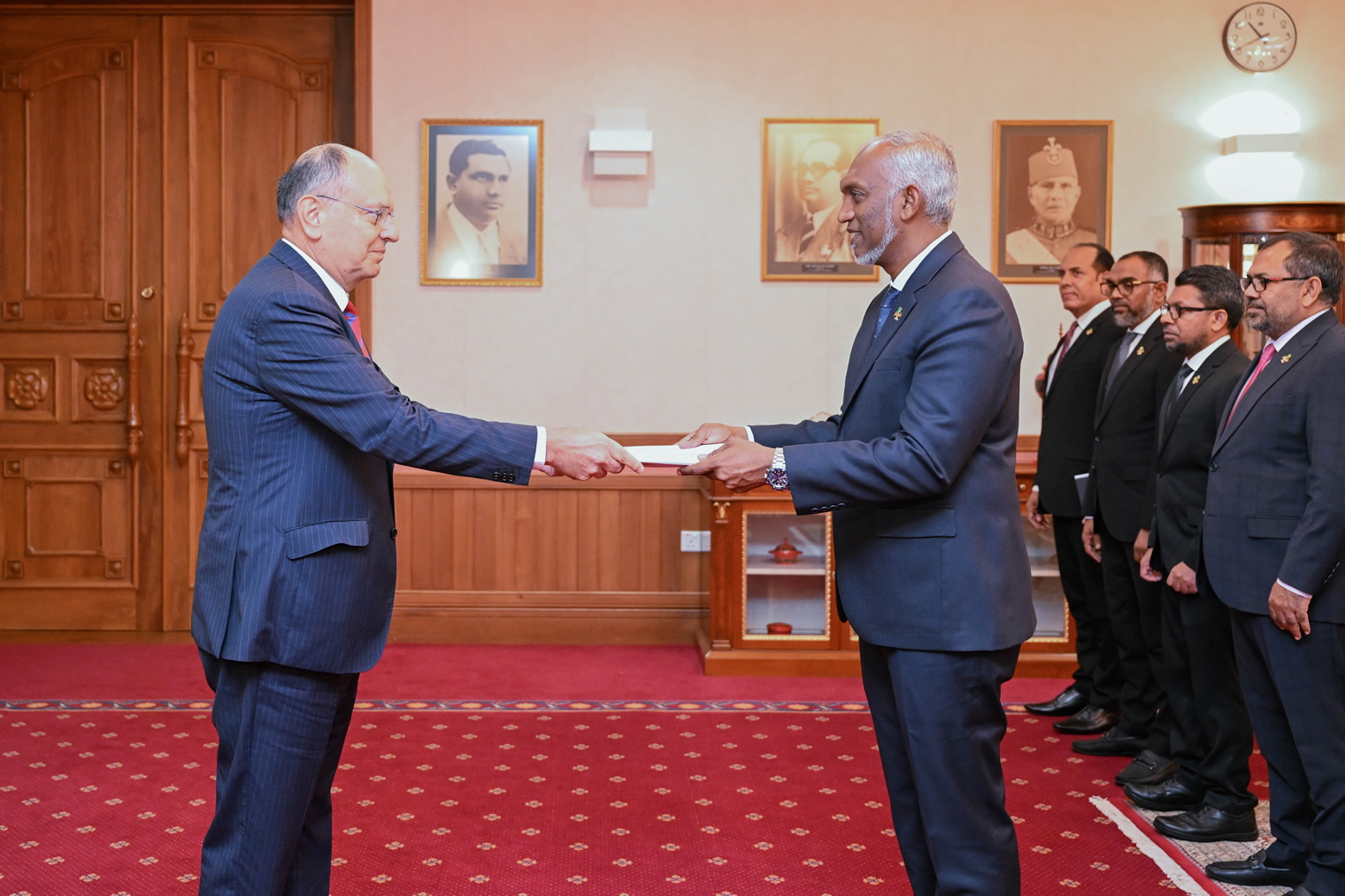 This morning, Javier Manuel Paulinich Verlarde, the Ambassador of the Republic of Peru to the Republic of Maldives, formally presented his Letters of Credence to President Dr. Mohamed Muizzu at a ceremony held at the President’s Office. The Ambassador was ceremoniously escorted from Republic Square to the President’s Office in a traditional “Haiykolhu” procession accompanied by the MNDF Drum and Trumpet Band.